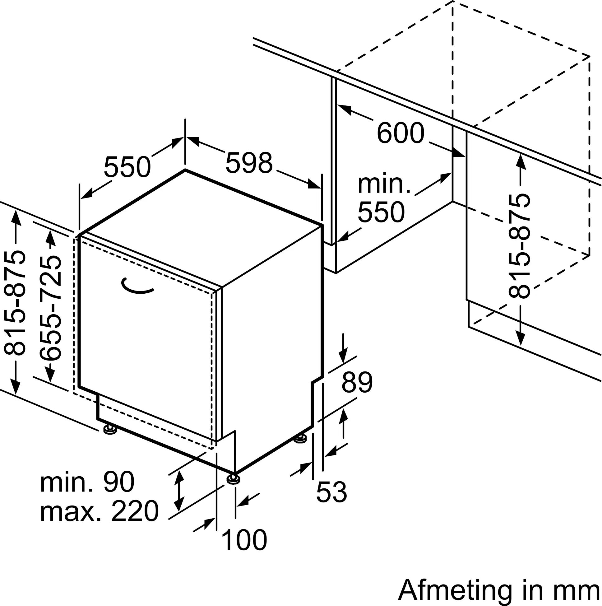 Meet de nishoogte en de hoogte van uw keukendeur zoals aangegeven op de tekening. Vul de maten in en controleer of deze vaatwasser past in uw keuken.