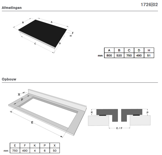 - Afmetingen van de kookplaat (LxBxD) (cm): 80 x 52 x 5,1 (HxBxD)